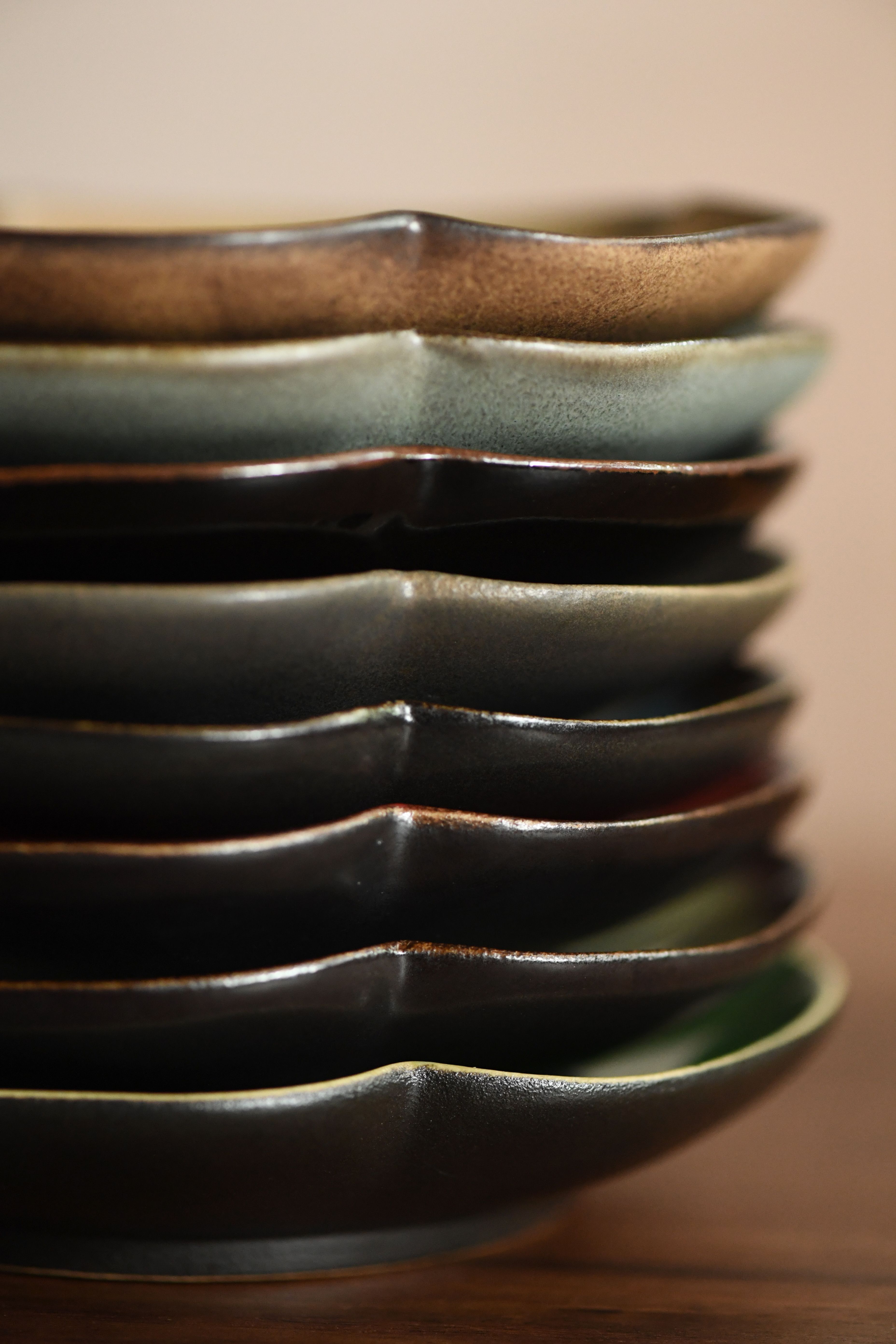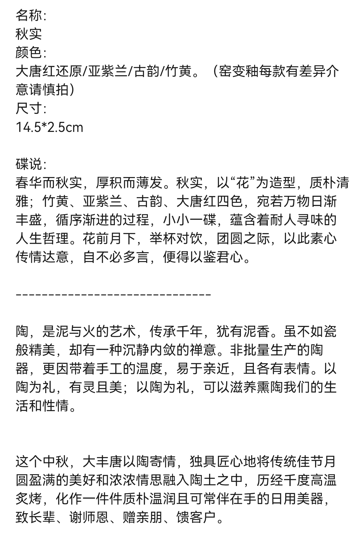 秋实,以“花”为造型,质朴清雅;竹黄、亚 紫兰、古韵、大唐红四色,宛若万物日渐丰盛, 循序渐进的过程,小小一碟,蕴含着耐人寻味 的人生哲理。14.5*2.5cm