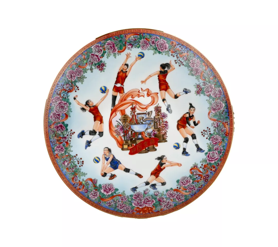 中国工艺美术大师翟惠玲广彩作品《女排精神》圆盘,以女排姑娘“无私奉献,团结协作,艰苦创业,自强不息”的时代英雄形象创作的。突出女排夺得的“奥运会“冠军杯、"世锦赛”冠军杯、"世界杯"冠军杯等奖杯成绩,围绕着奖杯以女排姑娘的发球、扣球、拦网、接球、传球、救球等一系列英姿表现主画面,表达女排姑娘“绝不放弃”的精神。圆盘的边饰以丝带玫瑰花表现,表达对中国女排"铿锵玫瑰”的美称与赞颂。翟惠玲的细致、工整、谨慎影响着其传承人周承杰,师徒二人力求把作品做到最好,共述广彩的传承故事。